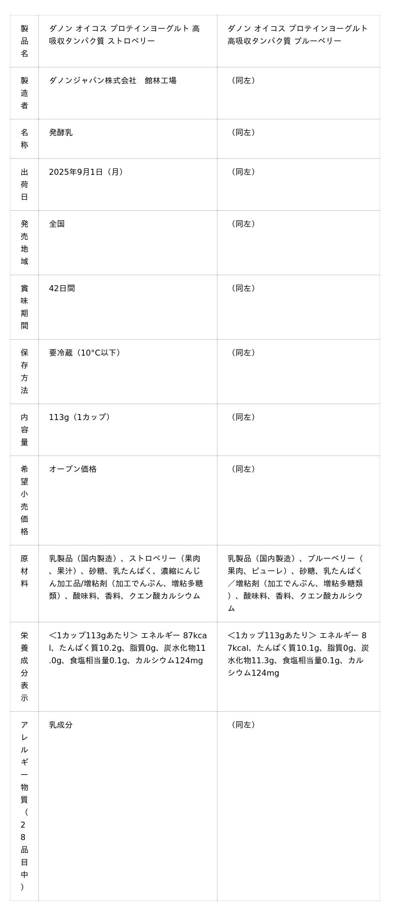 ダノンジャパン株式会社(本社:東京都目黒区、代表取締役社長:ロドリゴ・リマ、以下ダノンジャパン)は、カラダを動かすすべての人の良質なタンパク質補給を応援する「ダノン オイコス」ブランドにおいて、「ダノン オイコス プロテインヨーグルト 高吸収タンパク質」の人気フレーバーである「ストロベリー」および「ブルーベリー」をリニューアルします。リニューアルした製品は、2025年9月1日(月)より、全国のコンビニエンスストアおよびスーパーマーケット向けに順次出荷を開始します。「ストロベリー」は、果肉と果汁を10%増量し、いちごの甘みと酸味が引き立つ、贅沢で芳醇な味わいに仕上げました。濃厚なヨーグルトと果肉感あふれるソースが絶妙に絡み合います。「ブルーベリー」は、ワイルドブルーベリーの香りが際立つ、ジューシーで奥深い味わいが特長です。果実の甘みとヨーグルトの爽やかな酸味が調和し、ブルーベリー本来のおいしさを引き立てます。