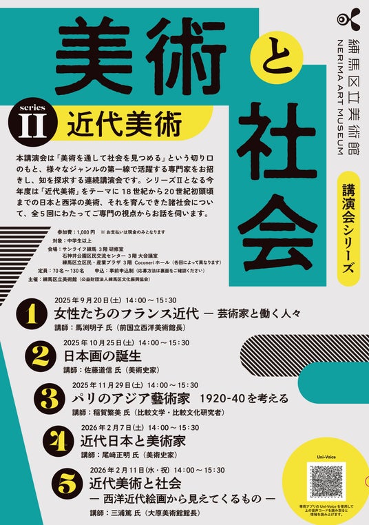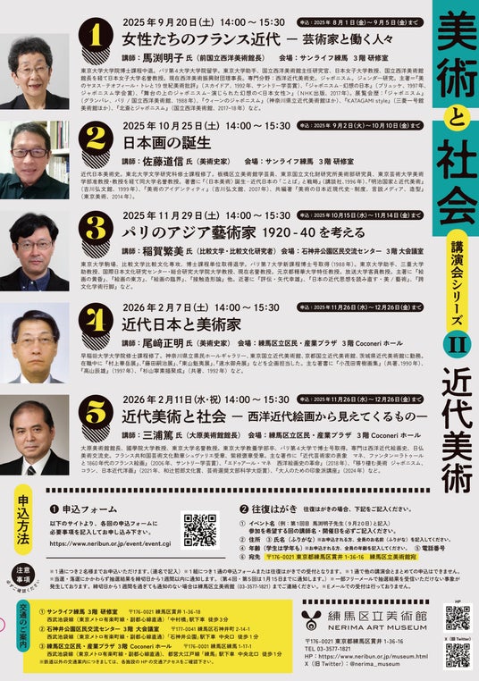 練馬区立美術館(東京都練馬区貫井)では、2025年9月から2026年2月にかけて、「美術と社会」講演会シリーズII:《近代美術》と題し全5回にわたって講演会を開催します。