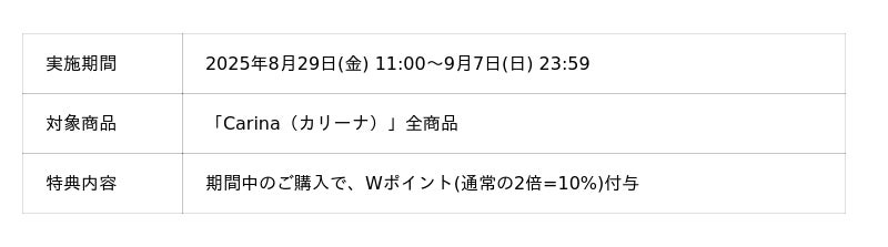 また新作発売を記念して、既存の人気アイテムを含む「Carina」コレクションご購入で、ポイント付与2倍のWポイントキャンペーンを開催します。
