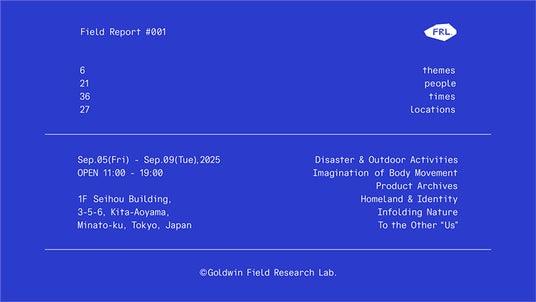 株式会社ゴールドウイン(本社:東京都港区/代表取締役社長 CEO:渡辺 貴生)は、2024年に始動したリサーチラボ&メディア「Goldwin Field Research Lab.(ゴールドウイン フィールドリサーチラボ)」が1周年を迎えるにあたり、これまでの成果を共有するエキシビション「Field Report #001」を、2025年9月5日(金)から9日(火)までの5日間、東京本社1Fイベントスペースにて開催します。