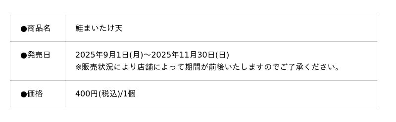 【磯揚げまる天】旬の味覚を楽しむ 秋限定の新商品「鮭まいたけ天」が登場!2025年9月1日(月)より一部店舗限定発売