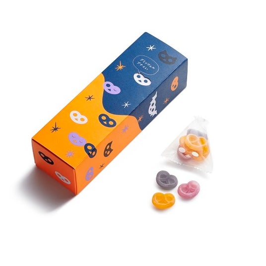 ハロウィン限定のブルーベリー味と、オレンジ味、グレープ味の3種のアソートで、「グミッツェルくん」とおばけがあしらわれたパッケージがハロウィンシーンを盛り上げます。ハロウィンイベント用のお菓子にはもちろん、化粧箱入りでそのままギフトとしてもお使いいただけるので、大人数向けの贈り物にもおすすめの商品です。
