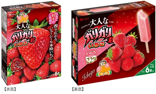 「大人なガリガリ君いちご」は、いちごアイスの中に、ガリガリ食感のジューシーないちごかき氷を入れたアイスキャンディーです。いちご果汁22%使用の本格的ないちごの風味をお楽しみいただけます。今回はかき氷部分にレモン果汁を隠し味に加え、いちごピューレも10%増量することで、いちごの風味を引き立たせ、さらに美味しくなりました。