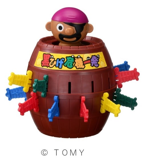 「黒ひげ危機一発」について1975年(昭和50年)7月1日に株式会社タカラトミーから発売された「黒ひげ危機一発」(海外では「Pop Up Pirate (ポップアップパイレーツ)」などの名称で発売)は、今年で発売50周年を迎えました。これまでに世界47以上の国と地域でパーティーゲームとして親しまれ、累計出荷数2,000万個を超えるロングセラー商品となりました。