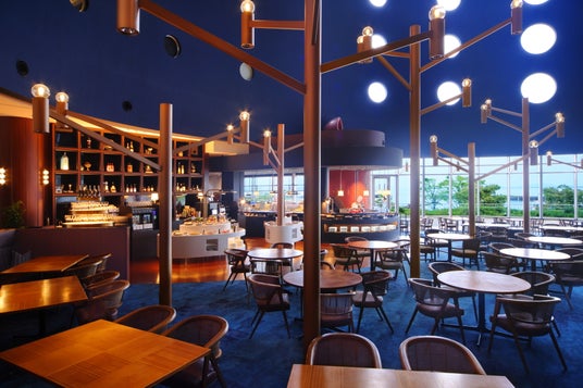 会場となる「イタリアンダイニング ベルラーゴ」は、大きな窓にびわ湖の景色が広がり、幻想的なブルーの壁に吹き抜け天井で落ち着く空間のレストラン。ランチ・ディナーともに、ピザ窯で焼く本格ピッツァをはじめ、多彩な前菜やパスタなど、出来立てのお料理をビュッフェ形式でご提供します。