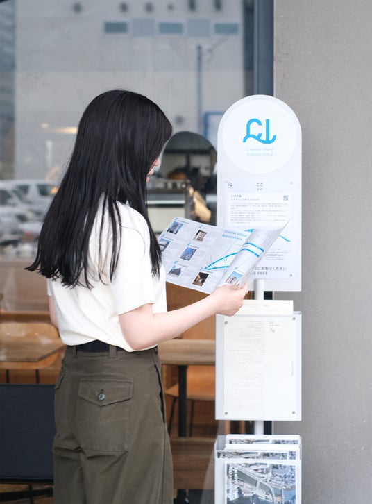 東西3.3キロの中之島を回遊・散策していただくために、2021年から中之島にある15施設のロビー等にミーティンポイント(サインスタンド)を設置しています。ここでは、15の物語の印刷物や美術館マップを配架し、中之島の文化情報と出会う場として活用しています。今回は、15の物語をAR化したバーチャルなビジュアルと、リアルな実際の風景が組み合わさる新たな芸術体験と、それぞれの物語を巡ることで中之島の多様な魅力を発見する、まち歩きのポイントとして活用しています。