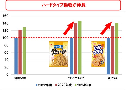 珍味市場では、いかフライをはじめとした揚物ジャンルが伸長しており、特に、サクサク・ザクザクとした食感の製品が好調に推移しています。魚介の素材の味わいや衣付け等の製法によって、いわゆるスナック菓子よりも食べ応えがあり、満足感をしっかり感じられる事が要因だと考えられます。