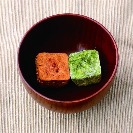 写真は伊勢湾で育ったあおさの薫るおみそ汁。個包装(1食)内に味噌と具材のブロックが2つ入っているのが特長