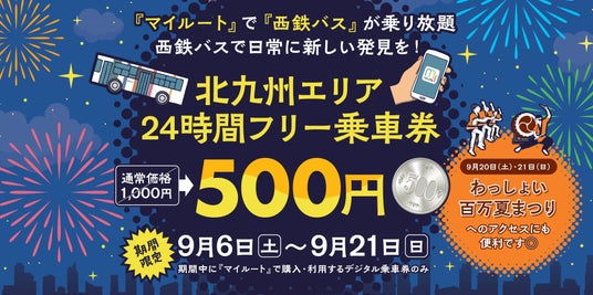 西鉄バス北九州(株)では、9月6日から21日までの期間限定で、トヨタファイナンシャルサービス(株)が提供するおでかけアプリ「my route」で販売中の「北九州エリア 24時間フリー乗車券」を、500円で販売するキャンペーンを実施いたします。