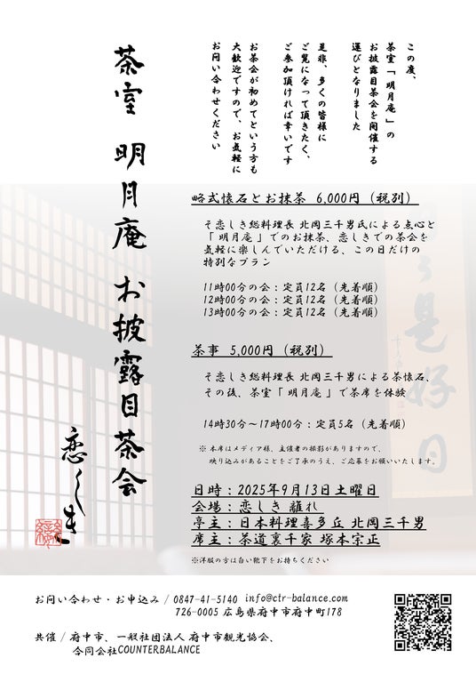 府中市と府中市観光協会(広島県府中市府中町、会長:高橋良昌)、合同会社COUNTERBALANCE(広島県府中市府中町、代表:菅信敬嗣)は、この度、国登録有形文化財「 恋しき 」内の離れ、茶室「 明月庵 」の復元に伴い、そのお披露目のためのお茶会を実施致します。