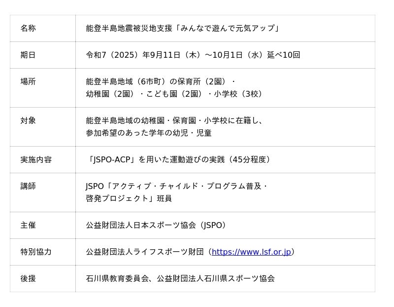 スポーツを「する」「みる」「ささえる」ための環境づくりを行うJSPO(正式名称:公益財団法人日本スポーツ協会 東京都新宿区/会長 遠藤利明)は、下記概要の通り、令和6年能登半島地震により甚大な被害を受けた地域に暮らし、不安やストレスを抱える子どもたちに対して、公益財団法人ライフスポーツ財団の特別協力のもと、「アクティブ・チャイルド・プログラム(JSPO-ACP)」を提供し、楽しみながら積極的にからだを動かすことで運動不足を解消するとともに、元気と活力を取り戻すことができるよう、支援に取り組みます。