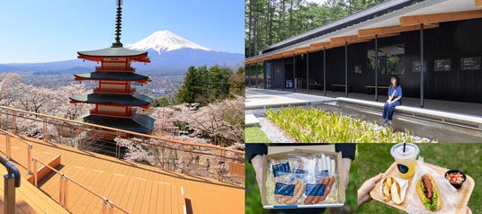 左:富士山と桜と五重塔が撮れる人気のフォトスポット。寄附金を活用し展望デッキを5倍に拡張。右:富士山ジビエセンター「DEAR DEER」。鹿肉ホットドッグのテイクアウトやお土産としてハムなどの加工品も購入できる。