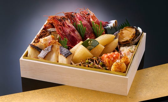 銀鮭マスタード焼/子持鮎昆布巻/牛肉しぐれ笹包み/焼きふぐ/味付いくら/本ズワイ蟹爪/かぶら甘酢漬/ボイルタラバガニ/金柑/小女子鰹節和え/帆立たらこ酒盗和え/田作り煮/のどぐろ広島菜巻/金目鯛昆布〆/子持ち昆布/にしん親子和え/瀬戸内産真蛸煮付け/姫竹煮/焼き湯葉/椎茸柚子煮/梅型こんにゃく