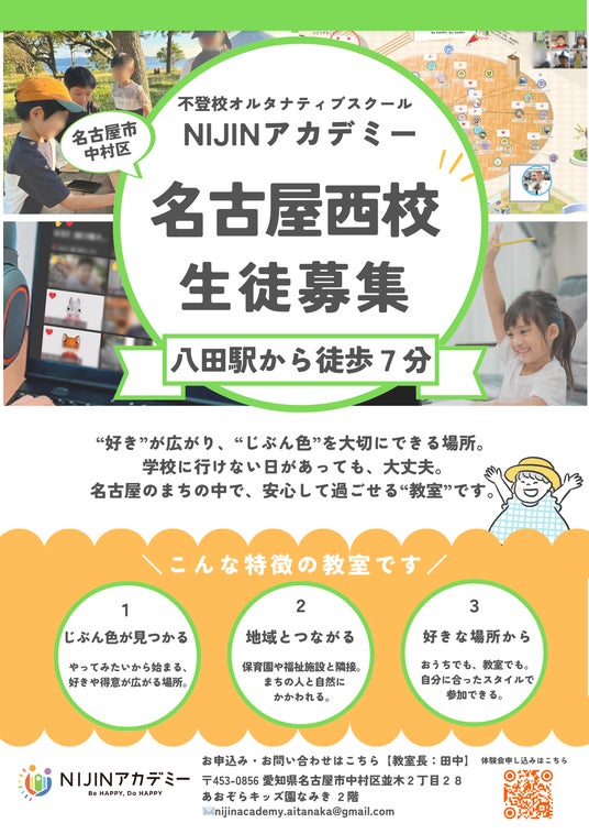 株式会社NIJIN(本社:東京都江東区、代表取締役:星野達郎)が運営する、不登校オルタナティブスクール『NIJINアカデミー』は、2025年9月1日(月)、愛知県名古屋市中村区にリアル教室「名古屋西校」を新規開校いたします。