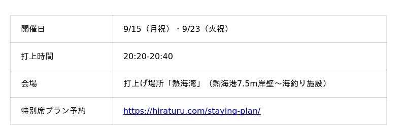 【夜空と海に咲く大輪の華】9月の熱海海上花火大会は計2回!15日(月祝)・23日(火祝)開催!特等席確約の送迎付きプランの販売中。空席少なくなっているので、ご予約はお早めに!