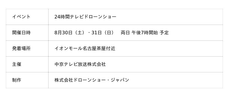 中京テレビ放送株式会社(本社:愛知県名古屋市、代表取締役社長:黒崎太郎)は2025年8月30日(土)・31日(日)に放送される「24 時間テレビ48」にて、新たな試みとして、東海エリアでは24 時間テレビで初となる「ドローンショー」を開催いたします。