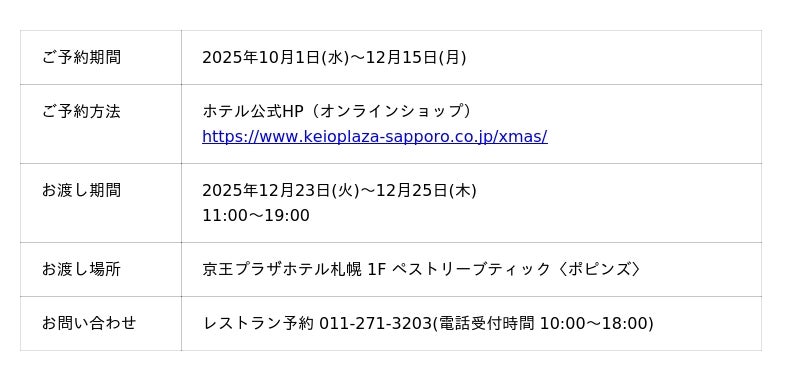京王プラザホテル札幌(代表取締役社長 本田敏人)は、2025年10月1日(水)より、特別なクリスマスケーキ3種類の予約受付を開始いたします。大切な方との心温まるひとときを、京王プラザホテル札幌が心を込めてお贈りするクリスマスケーキで、より華やかに演出いたします。