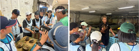 千葉県水産総合研究センターのすぐ近くにある東安房漁業協同組合本所川口畜養場に移動し、千葉県水産総合研究センターで学んだアワビなどの海洋資源を実際に見学しました。畜養場の役割を学び、海洋資源の保全や安定供給、付加価値向上のために、どのようなことが行われているのかを学びました。