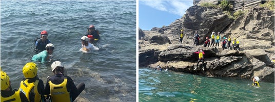 2日目の午後は、大房岬自然公園に移動し、海岸の岩場を歩いたり、よじ登ったり、海に飛び込んだりしながら進むアクティビティ「コーステアリング」を体験しました。前日に説明を受けた海女樽で実際に海に浮いてみたり、岩場から海に飛び込んでみたりと海を楽しみました。険しい道のりでしたが、五感をフルに使って自然とふれあい、海の豊かさを体感しました。