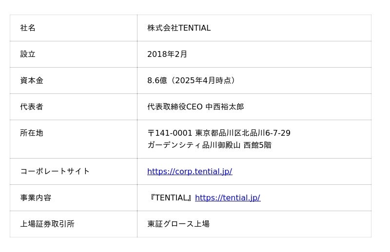 株式会社TENTIALは、「健康に前向きな社会を創り、人類のポテンシャルを引き出す。」をミッションに掲げ、コンディショニングブランド『TENTIAL』を運営しています 。代表取締役CEO中西裕太郎は、プロサッカー選手を目指した高校時代に病気で夢を絶たれた原体験から、自身のポテンシャルを最大限に発揮するためには健康と日々のコンディショニングが不可欠であると痛感 。この経験から株式会社TENTIALを創業し、世の中に「コンディショニングを実装する」ことを目指しています。コンディショニングブランド『TENTIAL』は、アスリートの知見と最新技術・研究に基づき、機能性を追求した製品・サービスを提供。24時間365日、日常生活のあらゆるシーンで心身を整え、疲労回復やパフォーマンス向上をサポートするコンディショニング活動を推進しています 。すべては個人のコンディションとポテンシャルを引き出すという信念のもと、株式会社TENTIALは、健康に前向きな社会の実現のため、コンディショニングの社会実装に取り組んでまいります。