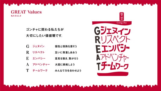 ゴンチャには、ゴンチャに関わる私たちが大切にしたい価値観「GREAT Values」があります。「ジェヌイン」「リスペクト」「エンパシー」「アドベンチャー」「チームワーク」の5つの行動規範に沿って、「幸せを淹れよう」というミッションの達成を目指しています。そして毎年9月は、改めて「GREAT Values」への理解を深める機会にするとともに、価値観を体現する期間としています。