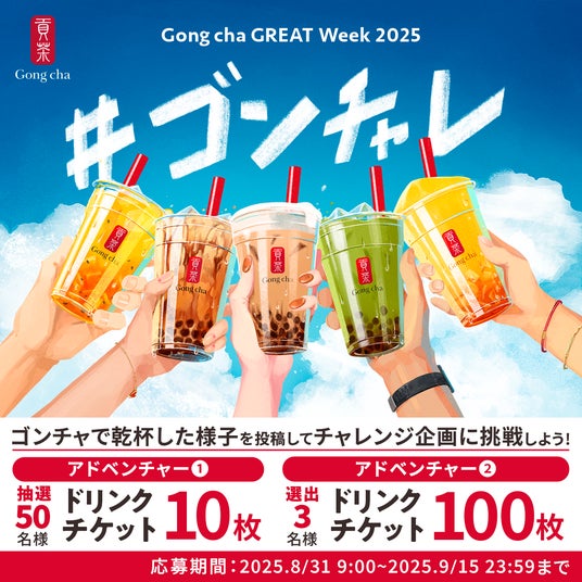 株式会社ゴンチャ ジャパン(本社:東京都港区、代表取締役社長:角田淳、以下ゴンチャ)は、2025年9月に迎える「GREAT Week」にあわせ、8月31日(日)よりゴンチャを楽しむ様子を撮影した写真や動画をSNSへ投稿いただくキャンペーン「#ゴンチャレ」を実施します。