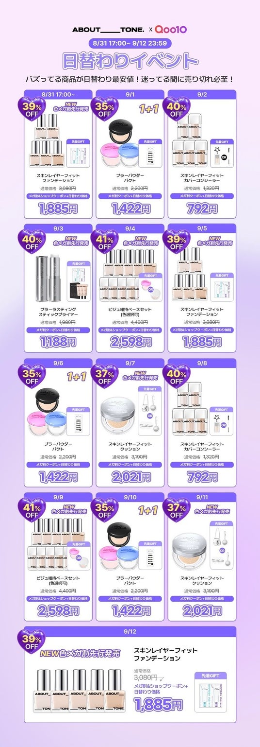 Qoo10メガ割期間中、日替わり特価イベントを開催いたします。ビジュ維持ベースラインの新色はもちろん、ベストアイテムのブラーパウダーパクトやメガ割限定GIFTまで、最安値でお得にお買い求めいただけます。