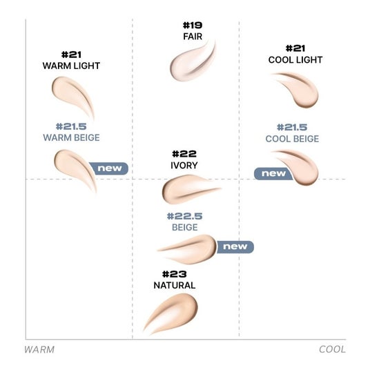 今回の新色は、従来のカラーバリエーションにおいて21号と23号の間のカラーに物足りなさを感じていた消費者のニーズを反映し、▲21.5号 クールベージュ ▲21.5号 ウォームベージュ ▲22.5号 ベージュの3色で構成されています。