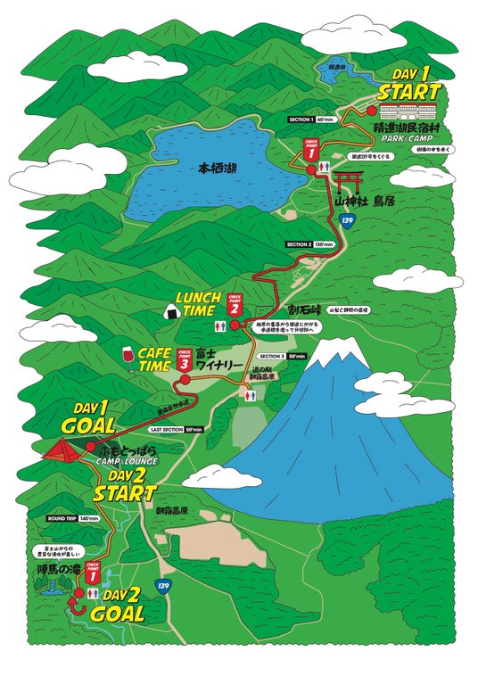 2日目はふもとっぱらから陣馬の滝まで片道約5kmの里山ハイク。自然の美しさはもちろん、その土地に息づく文化や暮らしも感じられる道のりです。ゴールからは来た道を引き返し、行きと違う方向から見ることで、新しい発見もあるはず。ふもとっぱらからはチャーターバスで、スタート地点の精進湖民宿村まで送迎があります。