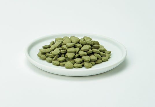 「あおつぶ」はモロヘイヤ100%の野菜粒です。原材料はモロヘイヤのみで、1粒に約2.5枚のモロヘイヤの葉が含まれています。