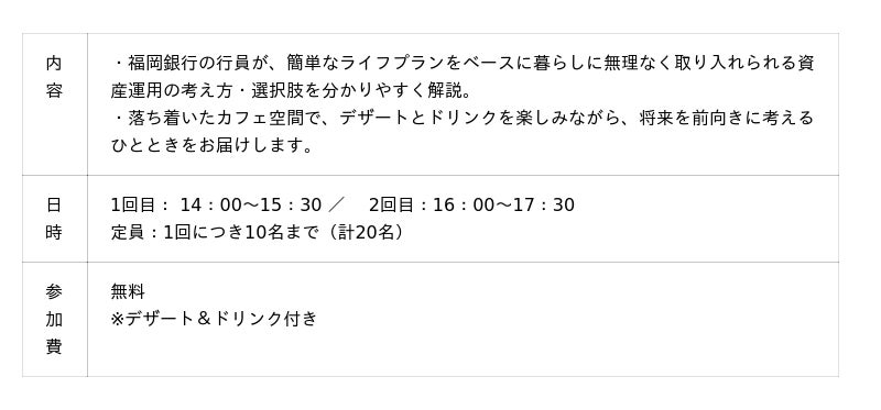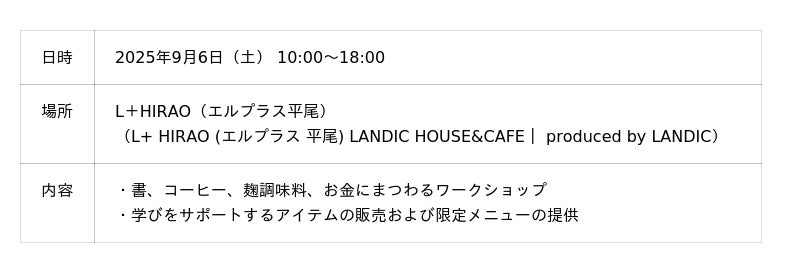 株式会社ふくおかフィナンシャルグループ(取締役社長 五島 久、以下「FFG」)は、株式会社LANDICホールディングス(代表取締役社長 兼 グループCEO 中山 朋幸、以下「LANDIC」)と共同で取り組んでいる「FFG × LANDIC Woman’s Wellness Project」の一環として、下記のイベントを開催いたします。本イベントでは”学び“をテーマに、”書に触れ文字を書く体験“、”静かな時間を楽しむコーヒーの淹れ方“ 、そして”「わたしらしい未来」を描くためのお金との付き合い方“等、多彩なプログラムを用意しています。中でも、FFG傘下の福岡銀行の行員が講師を務める「お金とわたし、これからの時間」ーお金にまつわるワークショップーでは、落ち着いたカフェ空間で、資産運用やライフプランについて気軽に学べる場を提供します。