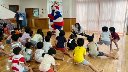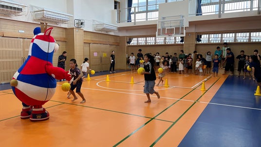訪問先の各施設では、キングスやゴーディーに関するクイズをはじめ、ストレッチやダンスを通じて体を動かす「ダンス交流」、ボールを使ったミニゲームやリレーを行う「ボール遊び」などを実施しました。ゴーディーの訪問を楽しみに、キングスロゴのミニフラッグを用意して歓迎してくれる園や、キングスやゴーディーのグッズを身に付けて会いに来てくれる子どもたちもいました。