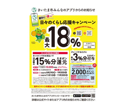 2.家計に”ほっ♪”日々のくらし応援キャンペーン (8月29日開始)さいたま市内在住の方を対象に、「さいたま市みんなのアプリ」の「さいコイン」でのお買い物時に決済額の15%分の「たまポン」を還元いたします。