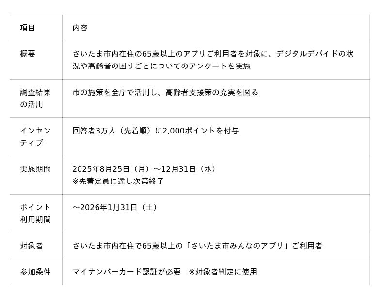 1.くらしの”声”を聞かせてキャンペーン (8月25日開始)さいたま市内在住の65歳以上のアプリご利用者を対象に、日常生活での困りごとやデジタルサービスの利用状況についてアンケートを実施いたします。ご回答いただいた内容は市の施策検討に活用し、より良い高齢者支援の実現を目指します。アンケートに回答いただいた方のうち、先着3万人に2,000ポイントを進呈いたします。