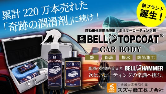 「奇跡の潤滑剤」ベルハンマーを生んだスズキ機工が新たな挑戦へ。今度は「艶出し」と「撥水」をテーマに開発した車用コート剤をリリース!C-VALUEクラウドファンディングにて先行販売を開始します。