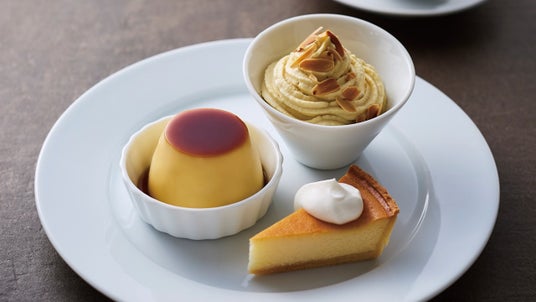 焼き芋クリームで仕立てたミニパフェ、カスタードプリン(ミニ)、デンマーククリームチーズケーキをワンプレートに盛り合わせました。