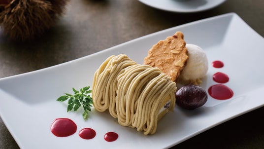 熊本産和栗のモンブランクリームで仕立てたモンブランケーキに、渋皮マロンとバニラアイス、モロゾフ人気の焼き菓子ファヤージュを添えました。秋の味覚をお楽しみいただける期間限定メニューです。