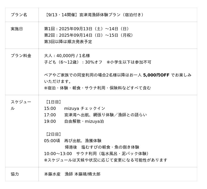 株式会社京都丹後企画(本社:京都府与謝郡与謝野町、代表:濱田 祐太)は、宮津駅前に本年5月にオープンした全9室のブティックホテル「 mizuya(みずや)」にて、「宮津湾 漁師体験宿泊プラン」を2025年09月13日(土)~15日(月祝)に開催致します。