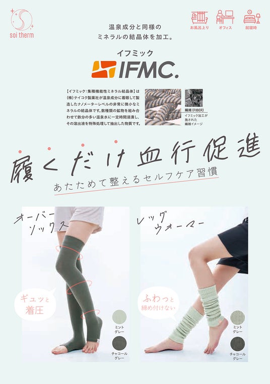 フランス語で「Soi=自分」「Therm=温泉」を意味する「Soi Therm」は、温泉成分に着目して開発された独自素材「イフミック(IFMC.)」を使用し、“履くだけ”で血行を促進。「イフミック:集積機能性ミネラル結晶体」は、株式会社テイコク製薬社が温泉成分に着眼して製造したナノメーターレベルの非常に微小なミネラルの結晶体です。数種類の鉱物を組み合わせて鉄分の多い温泉水に一定時間浸漬し、その溶出液を特殊処理して抽出した物質です。