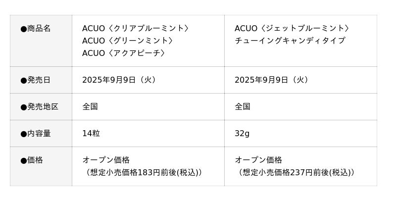 (火)に「ACUO〈クリアブルーミント〉」「ACUO〈グリーンミント〉」をリニューアル、また新フレーバー「ACUO〈アクアピーチ〉」とACUO初のチューイングキャンディ「ACUO〈ジェットブルーミント〉」新発売いたします。