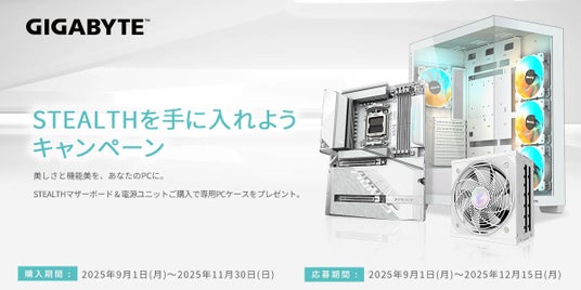 2025年09月01日(月)から2025年11月30日(日)までの期間で、対象の「STEALTH マザーボード + 電源ユニット(PSU)」新製品をご購入の上、応募すると STEALTH 背面配線対応 PC ケースがもらえるキャンペーンを開催いたします。