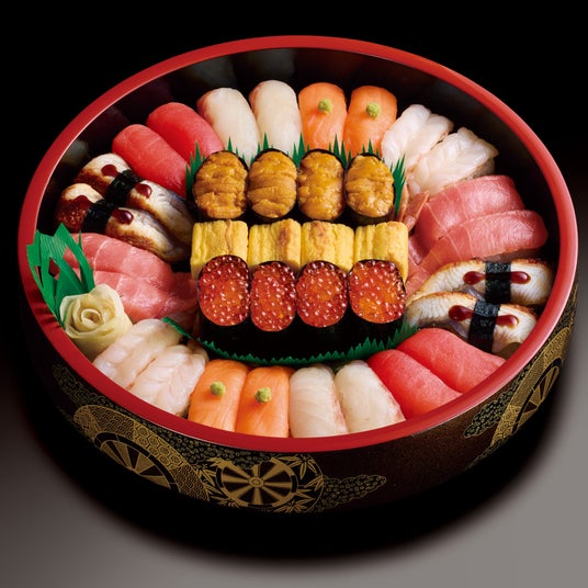 マグロ、真鯛、特選サーモン、うなぎ、生エビ、ウニ軍艦、中トロ、イクラ軍艦、切玉子