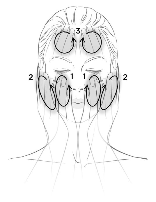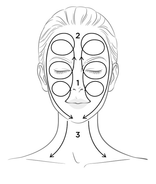 (1) 口元、頬、目元、額、首全体に広げながらなじませます。