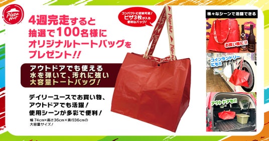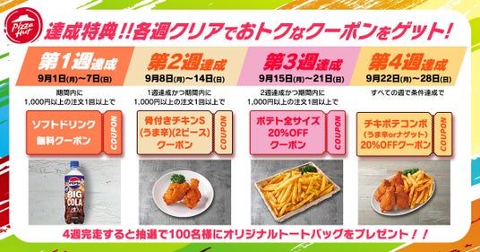 そして、見事4週目(9月22日~9月28日)まで完走された方全員には「チキポテコンボ(うま辛 or ナゲット)20%OFFクーポン」をプレゼント!さらに、完走者の中から抽選で100名様に、ピザハットオリジナルトートバッグが当たるというスペシャル特典もご用意しております!