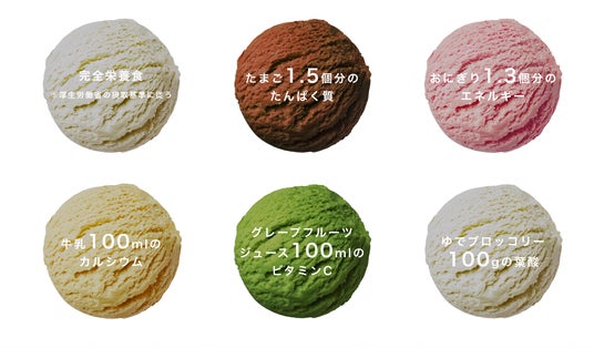栄養の特徴(一般的なアイスミルクとの比較・同量比)食物繊維:約28倍、ビタミンD:約25倍、鉄分:約22倍、亜鉛:約10倍、ビオチン:約5倍、アマニ油・大豆油などの不飽和脂肪酸も配合。33種類の栄養素をバランスよく含有し、摂食・嚥下に配慮した食感を追求。