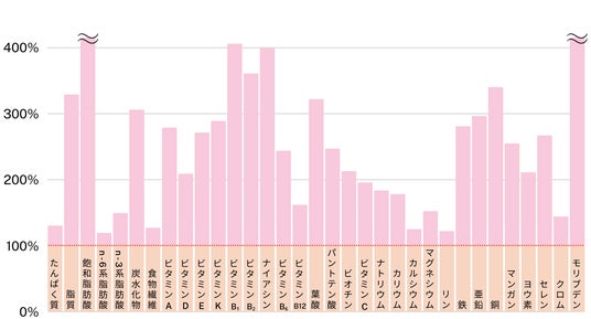厚生労働省が定める日本人の食事摂取基準(2025年版)に基づきKcalあたりの基準値を100%とした際の充足率