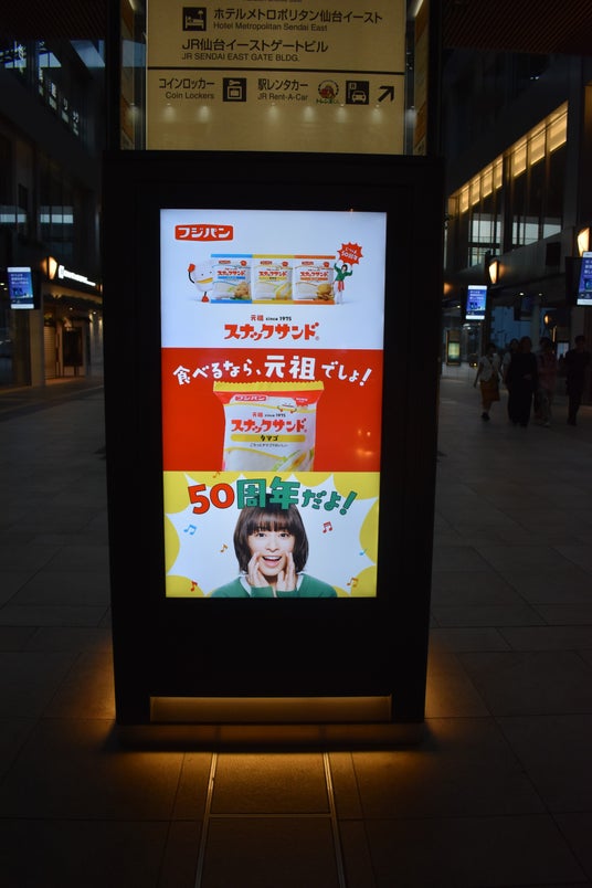 フジパン株式会社(愛知県名古屋市)は、2025年9月より放送される「スナックサンド」の新CMに合わせ、JR仙台駅構内で大型広告を掲出いたします。CM以外にも、大きなフラッグも掲載いたします。