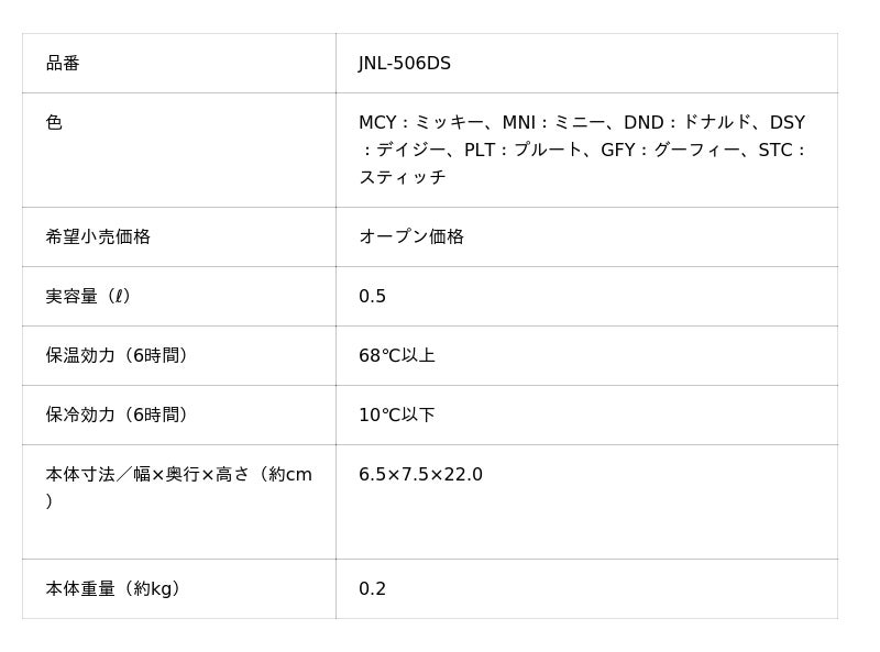 『真空断熱ケータイマグ(JNL-506DS)』 仕様一覧