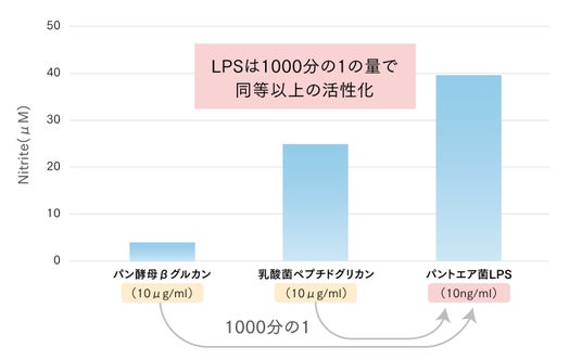ちなみに、自然免疫を活性化する物質はLPSだけでなく、例えば酵母の成分や、乳酸菌の成分も性化します。ですが、活性力が最も強力と言えるのがLPS。1/1000の量で、乳酸菌の1.5倍、酵母菌の10倍以上です。