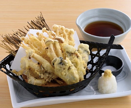 衣はカラッとサクサクで、ひと口たびかじれば中から旨みエキスがジュワッと広がる“牡蠣の天婦羅”と、あふれる牡蠣の香り豊かな旬の“秋が薫るきのこの天婦羅”の盛り合せです。旬の海の幸と 山の幸を一度に味わうことができます贅沢に。